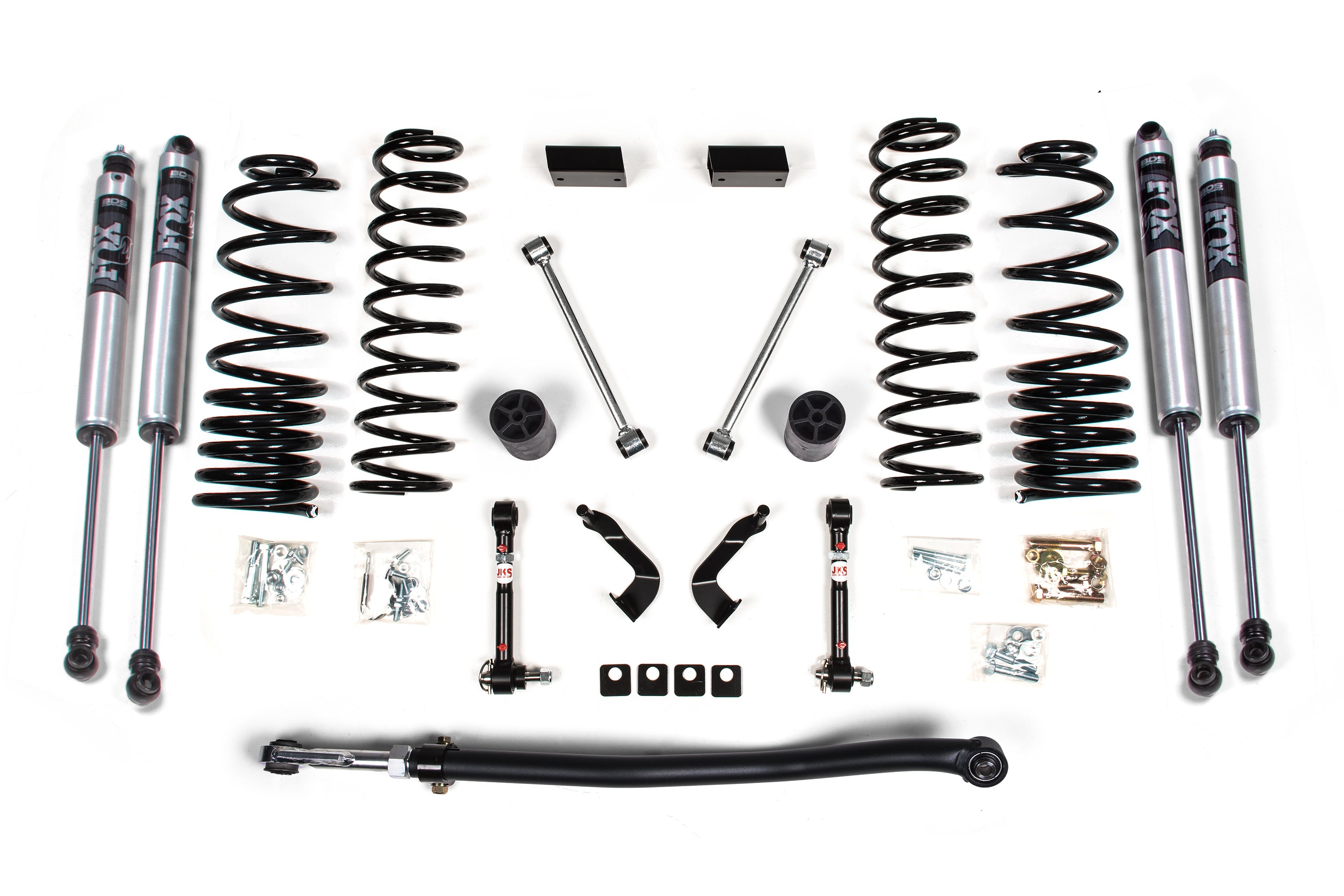 The lift kit includes front and rear BDS Pro-Ride Coil Springs, a heavy duty adjustable front track bar is utilized to recenter the front axle, bump stop extensions, front lower control arm cam locks, JKS quicker disconnects to unlock the front suspension's potential to flex while maintaining quiet on road operation, rear sway bar links, and your choice of specially tuned NX2 nitro series gas shocks or FOX 2.0 IFP performance series gas shocks to offer improved damper performance.