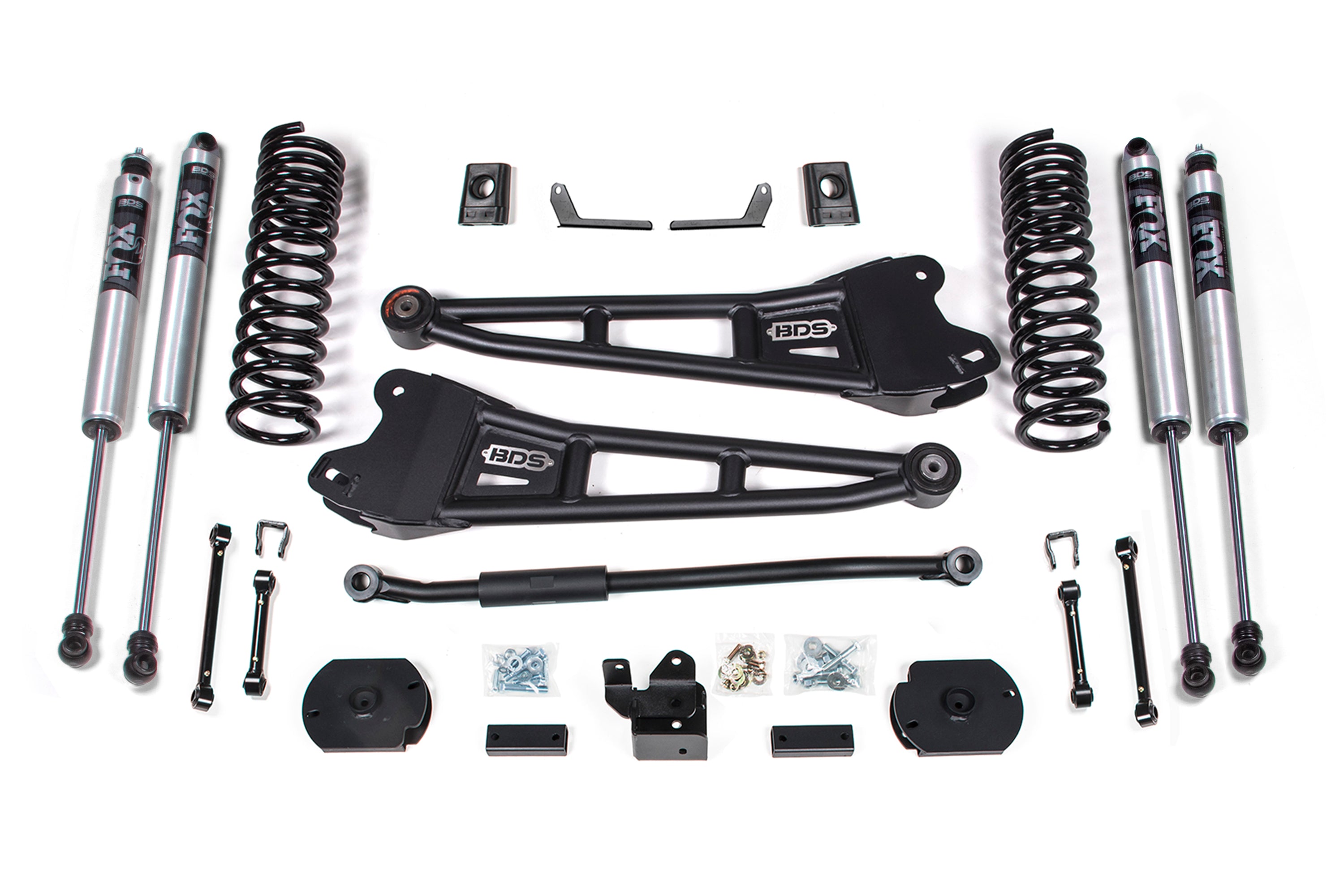 In the rear this kit utilizes a heavy duty air bag spacer brackets, track bar relocation bracket to correct axle positioning, bump stop extensions, and a matching set of NX2 Nitro or FOX 2.0 Performance shocks. BDS also supplies new air ride leveling sensor brackets to re-position the ride height sensors allowing it to perform just like it does at factory ride height and maintain full air bag range of motion.