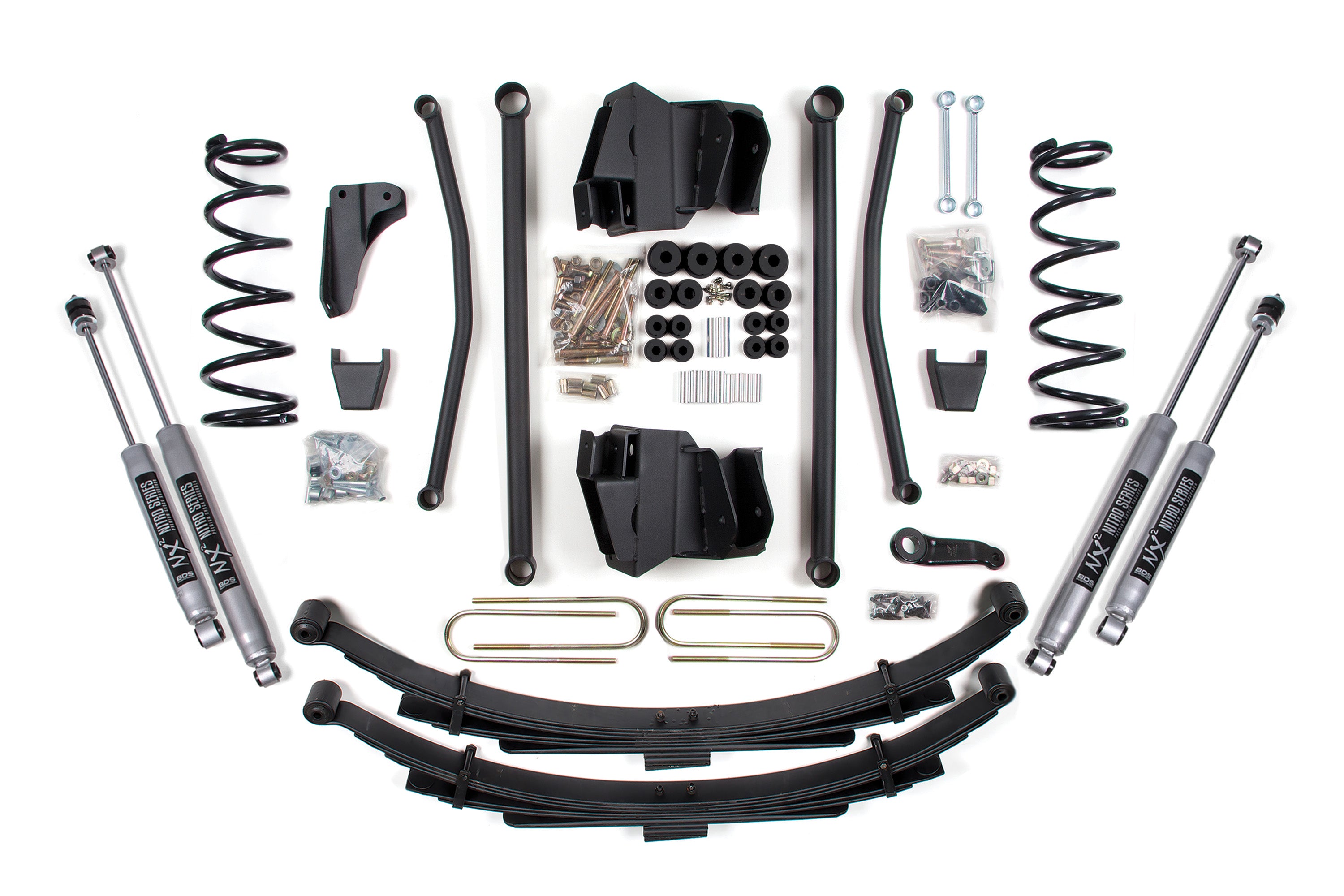 Up front the lift kit includes gas-specific Pro-Ride coil springs, all four control arms plus mounting bracket, forged drop pitman arm and track bar bracket for steering correction, bump stops, sway bar links, and precision tuned NX2 or FOX 2.0 nitrogen charged shocks. In the rear this kit utilizes heavy duty cast steel blocks, longer u-bolts, and a matching set of NX2 Nitro or FOX 2.0 Performance shocks.