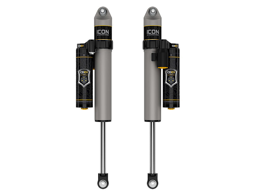 ICON Vehicle Specific (V.S.) 2.5 Aluminum Series shocks with CDCV are designed and built to give your vehicle outstanding performance off-road and a smooth ride on the street. These shocks are configured specifically for each application in both length and damping tune. Like all ICON'S Shock Absorbers, V.S. 2.5 Aluminum Series shocks are 100% rebuildable and 100% revalveable. For piggyback and specific remote reservoir applications, ICON'S unique use of a 6061 billet aluminum manifold a few inches below the top cap of the shock creates an internal Bump Zone that when used creates an additional 20% of damping force. This additional force helps prevent harsh bottom outs and controls the suspension when compressing at high velocity. The ICON CDE Valve upgrade is included for those desiring an easy way to tune the ride electronically from inside the vehicle. Compression Damping Electronic Valve (CDEV) is an electronically controlled valve that meters the flow of oil to regulate the amount of damping force that is created by the shock when compressed. This infinitely variable valve can react in less than 40ms and has the ability to make extremely precise adjustments for varying terrain. CDEV's hydraulic circuits are also custom tailored per application to create the highest resolution and dynamic range allowable for each specific vehicle. Powered by ICON Intelligent Control and proprietary ICON mobile app, the system uses information from the onboard G-force sensor and Gyroscope to perform calculations based on algorithms and user-defined settings to predict terrain and adjust shock settings via the CDEV accordingly.